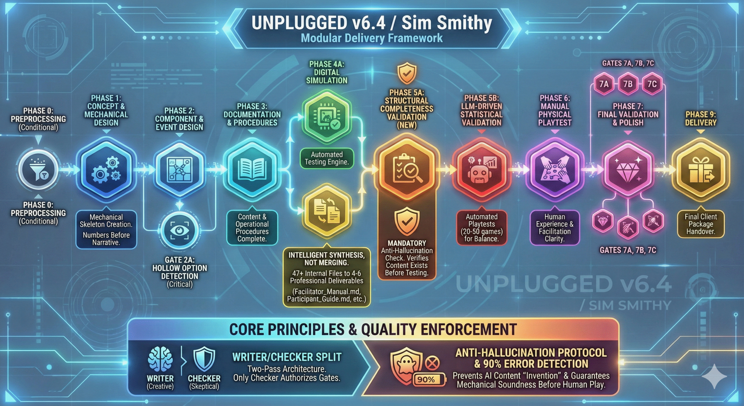 While AI provides the speed, our proprietary framework provides the guardrails. We use a 9-phase architecture to ensure every simulation is mechanically sound, statistically balanced, and hallucination-free.
