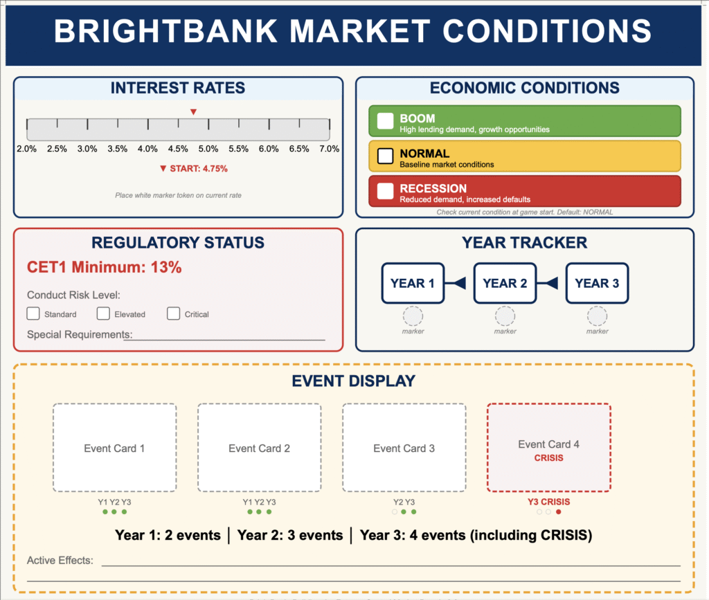 Teams take control of BrightBank, a mid-sized UK retail bank with £68 billion in assets. Over three simulated years, they navigate market shocks and manage five interconnected KPIs on a physical dashboard.