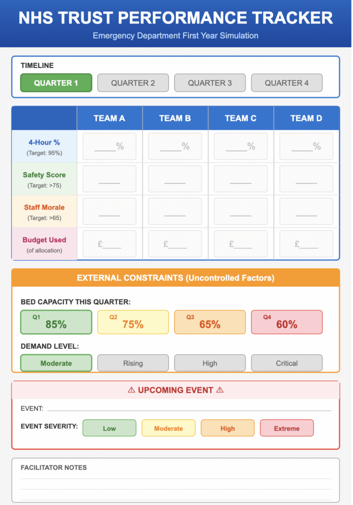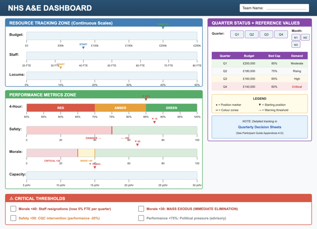 Teams manage a single NHS Emergency Department through four quarters of operation. They face identical external pressures—flu spikes, recruitment delays, and bed block—but make independent decisions on staffing, pathways, and crisis response.