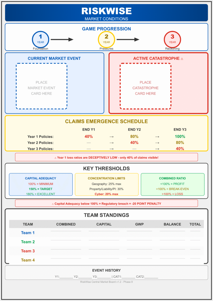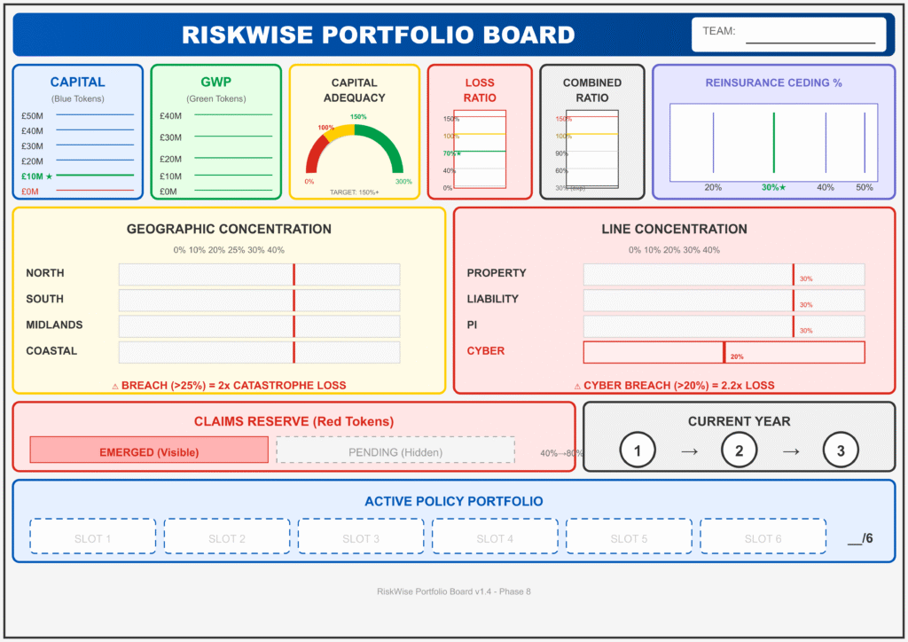 Key Feature: The Concentration Penalty Diversification is enforced mechanically. If a team exceeds 25% exposure in any single region or line of business, the simulation triggers a “Concentration Multiplier.” When a catastrophe card (like a Flood or Cyber Attack) is drawn, these teams suffer double losses, turning a manageable event into a solvency crisis.