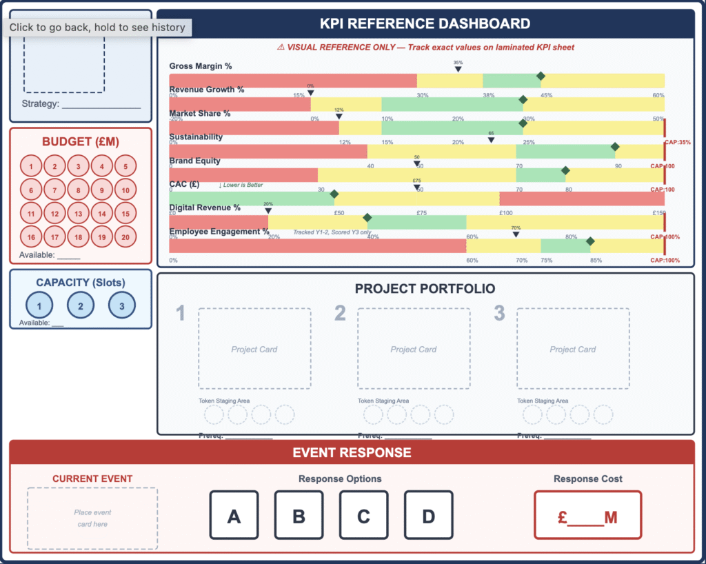 Secondary Feature: Dynamic Market Events A deck of 24 event cards introduces external shocks—interest rate hikes, competitor moves, and a guaranteed Year 3 crisis. All teams face identical events but respond independently, allowing for rich comparative debriefs.