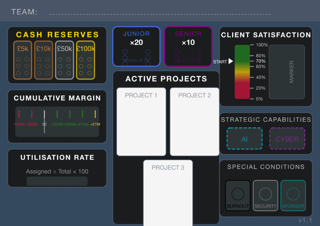 Teams run competing tech consultancies, managing a bench of physical Junior and Senior Consultant tokens. They must navigate the tension between winning work in the Market Phase and executing it in the Delivery Phase, all while managing Utilisation Rates and Client Satisfaction.