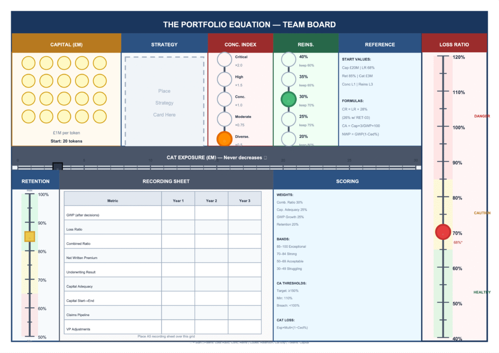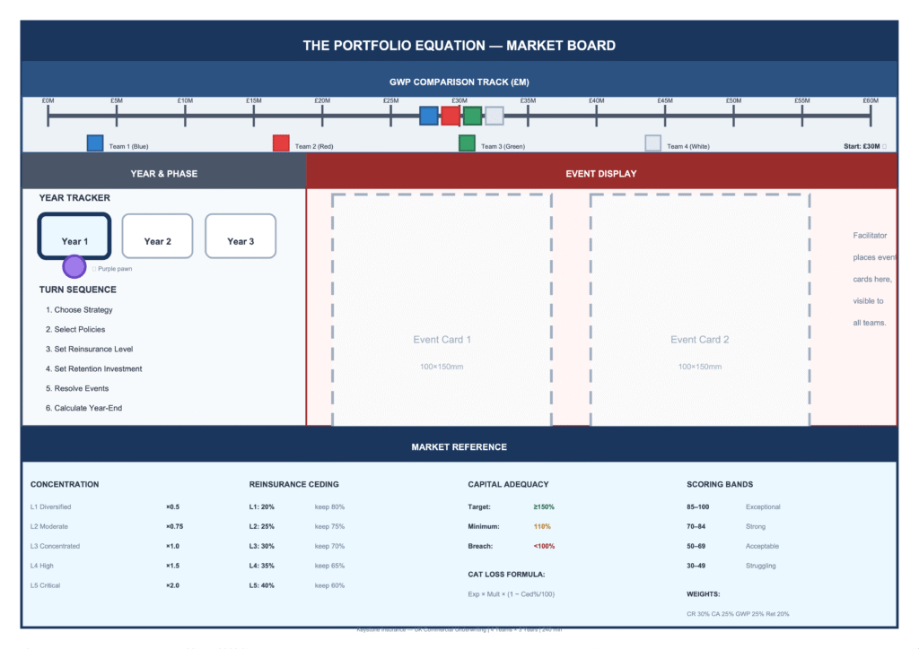 Teams take control of a mid-sized UK commercial insurer over a three-year simulated period. They must balance growth against capital constraints, select from unique one-shot policy cards, manage reinsurance positioning, and protect retention — all while a single concentration index tracks how dangerously exposed their portfolio is becoming.
